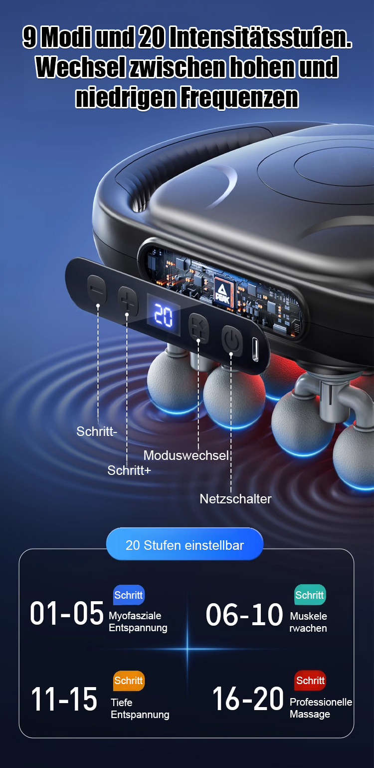 ✨16-Kopf-Massagepistole für Ganzkörpermassage, 9 Modi mit 20 Intensitätsstufen, lindert Schmerzen und Beschwerden